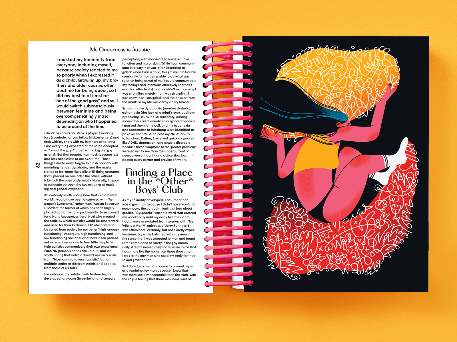 I pulled together a collection of personal narratives, whether they be stories, poetry, interviews, or art. These serve to amplify the voices of Queer and Autistic creators and to celebrate their stories. Throughout the book, there are also and to provide a solid vocabulary to learn to better understand and support these communities both independently and in tandem with each other.